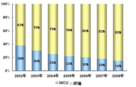 一般來(lái)說(shuō),終端和MCU是視頻會(huì)議系統(tǒng)產(chǎn)品最為關(guān)鍵的部分。計(jì)世資訊(CCW Research)的研究表明:近年來(lái),終端的銷(xiāo)售比例持續(xù)增長(zhǎng),而MCU的銷(xiāo)售比例則相應(yīng)萎縮。2005年,終端和MCU的比例分別為78.0%和22.0%。