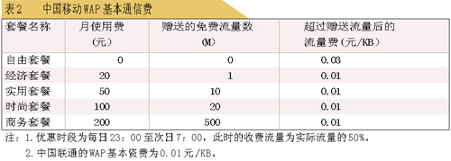 1X的優(yōu)勢是技術先進,速度快,但部分地區(qū)網(wǎng)絡覆蓋不足,開通國際漫游數(shù)據(jù)業(yè)務的國家少。此外,在收費上雙方也有不同。表2是中國移動與中國聯(lián)通WAP基本通信費比較(各省之間略有不同)。