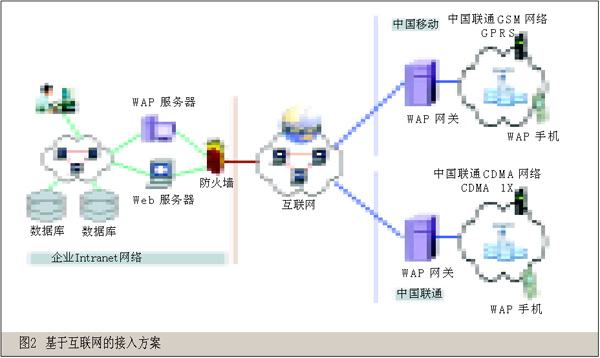 在這種方式中,企業(yè)員工無論使用GSM還是CDMA制式手機均可以訪問WAP服務器,即使國際漫游狀態(tài)也可以通過當?shù)氐?.5G(或2G)網(wǎng)絡登錄Internet訪問企業(yè)的信息,WAP手機設置采用運營商提供的標準設置,具有較強的技術通用性。