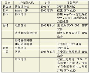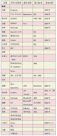 1999年,英國Video Networks公司率先在全球推出了IPTV業(yè)務(wù),此后,國外許多電信運營商先后進入IPTV市場。但在2004年之前,多數(shù)運營商僅側(cè)重于IPTV的試驗,2004年后,IPTV開始從試驗階段向商用階段轉(zhuǎn)變,許多業(yè)界人士認(rèn)為,2005年將成為IPTV年。