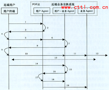 在POP點處,每類業(yè)務(wù)有一個“業(yè)務(wù)Agent”,其生命周期與運營商此類業(yè)務(wù)的生命周期相同,即從運營商開通此類業(yè)務(wù)到運營商終止提供此類業(yè)務(wù)為止,因此“業(yè)務(wù)Agent”基本上是長期存在的!皹I(yè)務(wù)Agent”負責對不同用戶的同類業(yè)務(wù)進行匯聚,統(tǒng)一與遠端的“業(yè)務(wù)Agent”進行業(yè)務(wù)交互。