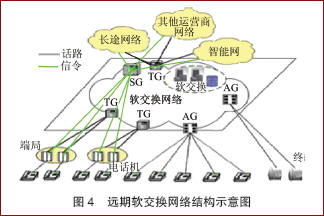 隨著PSTN用戶逐步轉(zhuǎn)變?yōu)檐浗粨Q網(wǎng)絡(luò)用戶,未來以軟交換網(wǎng)絡(luò)為核心、PSTN端局作為接入的網(wǎng)絡(luò)結(jié)構(gòu)將逐步形成。如圖4所示,軟交換網(wǎng)絡(luò)將覆蓋包括PSTN用戶在內(nèi)的各種類型的用戶終端,具有SSP功能,提供智能網(wǎng)業(yè)務(wù);具備大容量關(guān)口局功能,實現(xiàn)與其他運營商網(wǎng)絡(luò)的互通。