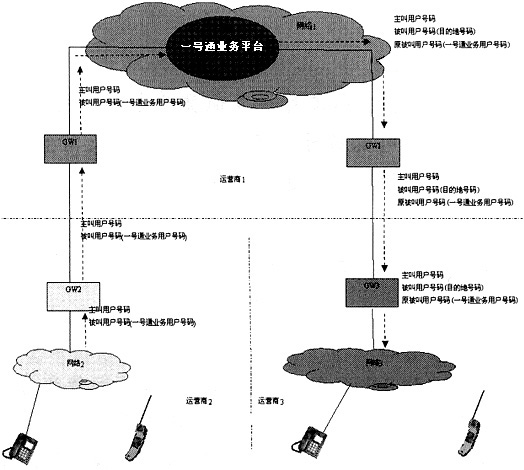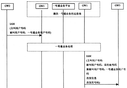 在圖1中,運營商2的用戶撥叫運營商1的一號通業(yè)務(wù)用戶號碼時,呼叫將通過運營商2的網(wǎng)關(guān)(GW2)、運營商1的網(wǎng)關(guān)(GW1)接續(xù)到運營商1的一號通業(yè)務(wù)平臺中。一號通業(yè)務(wù)平臺根據(jù)一號通業(yè)務(wù)用戶設(shè)置的接續(xù)規(guī)則,將呼叫翻譯到指定的目的地號碼。目的地號碼可能是運營商1的用戶,也可能是其他運營商的用戶。
