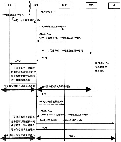 基于目前現(xiàn)網(wǎng)的信令處理方式,當(dāng)一號通業(yè)務(wù)用戶所設(shè)定的目的地號碼為移動用戶時,如果出現(xiàn)被叫用戶忙、關(guān)機等接續(xù)不成功情況,現(xiàn)有的移動交換機會給主叫用戶播放錄音通知,通知用戶,如果主叫用戶不掛機,則在通知播放完畢后向前端交換機后向返回REL消息,釋放呼叫。一號通業(yè)務(wù)平臺收到釋放消息后根據(jù)業(yè)務(wù)需要,進(jìn)行下次接續(xù)。如果按照原有的信令流程,主叫用戶會先聽到被叫用戶忙或關(guān)機的錄音通知,然后又聽到下一個呼叫的回鈴音。為了避免出現(xiàn)這種現(xiàn)象,一號通業(yè)務(wù)平臺要能夠屏蔽被叫側(cè)播放的錄音通知和信號音,并根據(jù)業(yè)務(wù)需要向主叫用戶播放合適的信號音或錄音通知,具體的屏蔽方式由一號通平臺自行確定。以智能網(wǎng)實現(xiàn)、ISUP消息為例,具體的消息流程如圖3所示。
