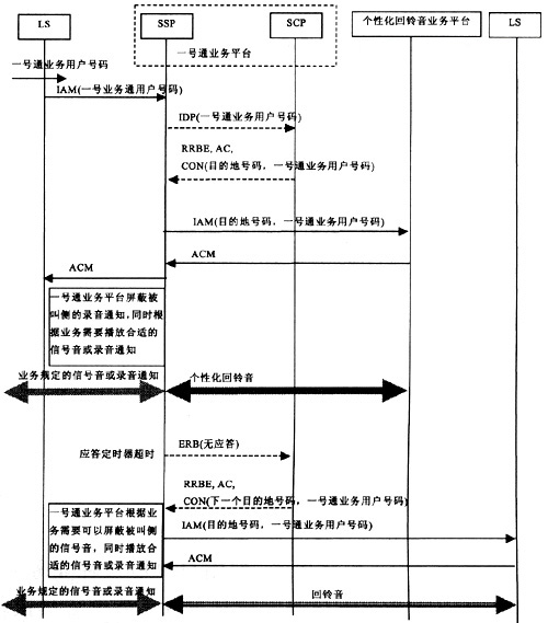 按照圖3所示的信令方式,一號通業(yè)務(wù)平臺屏蔽被叫側(cè)錄音通知后,如果被叫用戶申請了個性化回鈴音業(yè)務(wù),則會產(chǎn)生一號通業(yè)務(wù)與個性化回鈴音業(yè)務(wù)之間的互斥性,即如果一號通業(yè)務(wù)用戶所設(shè)定的目的地號碼申請了個性化回鈴音業(yè)務(wù),個性化回鈴音業(yè)務(wù)平臺給主叫用戶播放的錄音通知會被一號通業(yè)務(wù)平臺所屏蔽,主叫用戶將聽到由一號通業(yè)務(wù)平臺統(tǒng)一播放的信號音或錄音通知,而聽不到個性化回鈴音。以智能網(wǎng)實現(xiàn)、ISUP消息為例,具體的消息流程如圖4所示。