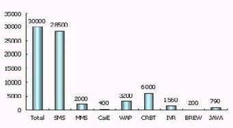 2005年,中國(guó)的移動(dòng)增值業(yè)務(wù)用戶規(guī)?倲(shù)達(dá)到了3億,其中短信用戶伴隨移動(dòng)通信用戶的穩(wěn)定增長(zhǎng)而增長(zhǎng),MMS、CaiE、JAVA、BREW等數(shù)據(jù)業(yè)務(wù)隨著終端的普及以及產(chǎn)品的豐富,增長(zhǎng)很快,以上四類數(shù)據(jù)增值業(yè)務(wù)累計(jì)用戶2005年已超過2500萬(wàn)。