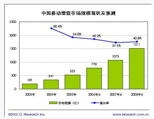隨著中國(guó)移動(dòng)電話用戶(hù)的不斷增長(zhǎng)和移動(dòng)增值服務(wù)的不斷發(fā)展創(chuàng)新,移動(dòng)增值服務(wù)已經(jīng)成為現(xiàn)隨著市場(chǎng)的發(fā)展和不斷規(guī)范,中國(guó)移動(dòng)增值服務(wù)市場(chǎng)將進(jìn)入相對(duì)平穩(wěn)的發(fā)展階段。據(jù)iResearch預(yù)測(cè),中國(guó)移動(dòng)增值服務(wù)的市場(chǎng)規(guī)模增長(zhǎng)速度將逐年減緩,到2008年受奧運(yùn)會(huì)影響增長(zhǎng)速度提高,規(guī)模將突破1500億元。