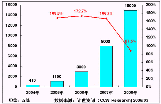 主流運(yùn)營商N(yùn)GN網(wǎng)絡(luò)的規(guī);ㄔO(shè),為IP Centrex、寬帶電話等新業(yè)務(wù)在國內(nèi)的大規(guī)模應(yīng)用提供了良好的支撐。計(jì)世資訊(CCW Research)預(yù)計(jì),在未來3年內(nèi),中國的NGN網(wǎng)絡(luò)建設(shè)規(guī)模將獲得快速增長,到2008年,將有望達(dá)到1.5億線的規(guī)模。