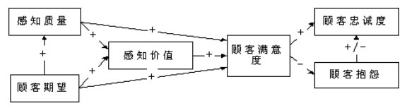 該模型是由六個隱變量組成的因果模型,其中顧客滿意度是最終要求的目標變量,感知質量、感知價值和顧客期望是因變量,而顧客忠誠度和顧客抱怨則是顧客滿意與否的結果變量。