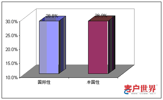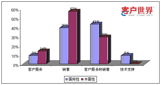 從業(yè)務(wù)功能看來(lái),國(guó)際性呼叫中心和本國(guó)性呼叫中心承擔(dān)著不同的角色。9%的國(guó)際性呼叫中心和14%的本國(guó)性呼叫中心提供僅限于客戶服務(wù),例如賬號(hào)查詢和催費(fèi)收款。39%的國(guó)際性呼叫中心和59%的本國(guó)性呼叫中心專(zhuān)門(mén)展開(kāi)網(wǎng)上營(yíng)銷(xiāo)和銷(xiāo)售(外撥為主)。43%的國(guó)際性呼叫中心和29%的本國(guó)性呼叫中心同時(shí)承擔(dān)客戶服務(wù)和銷(xiāo)售功能。最后,我們調(diào)查到9%的國(guó)際性呼叫中心專(zhuān)門(mén)從事技術(shù)支持,而且這些中心專(zhuān)門(mén)為國(guó)際市場(chǎng)設(shè)立。服務(wù)功能上的差異會(huì)對(duì)商業(yè)定位和人力資源管理提出不同的要求。