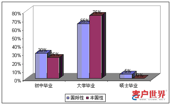總的而言,參加調(diào)研的呼叫中心雇用的員工接受了平均15年的正式教育,也就是大學(xué)畢業(yè)的一般水平。國(guó)際性和本地型呼叫中心在勞動(dòng)力的受教育水平上沒(méi)有呈現(xiàn)明顯差異。其中,30%的國(guó)際性和25%的本國(guó)性呼叫中心大量雇用初中畢業(yè)程度(12年教育)的員工;65%的國(guó)際性和75%的本國(guó)性呼叫中心雇用高中畢業(yè)程度(15年教育)的員工;此外,5%的國(guó)際性呼叫中心,往往是提供技術(shù)支持服務(wù),主要雇用碩士畢業(yè)水平(17年教育)的員工。