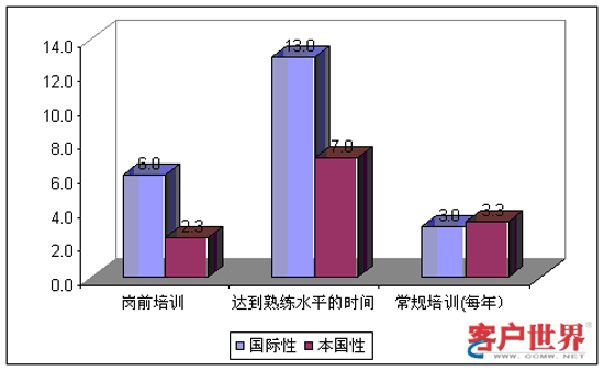 總體看來(lái),印度呼叫中心提供平均為4.1周的崗前培訓(xùn)。其中,國(guó)際性呼叫中心平均提供6周崗前培訓(xùn),明顯高于本地性呼叫中心的2.3周。這是因?yàn)閲?guó)際呼叫中心把崗前培訓(xùn)的相當(dāng)一部分時(shí)間投入到英語(yǔ)能力的培訓(xùn)和提高上面。此外,參加調(diào)研的呼叫中心主管認(rèn)為,新員工平均在開(kāi)始工作10周以后才能達(dá)到熟練水平。同樣地,我們發(fā)現(xiàn)國(guó)際性呼叫中心和本地性呼叫中心在這一指標(biāo)上存在顯著差異。在國(guó)際性呼叫中心需要達(dá)到熟練水平的時(shí)間
