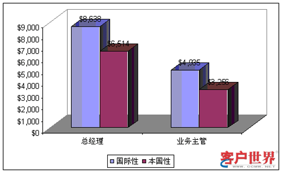 管理人員的薪酬水平明顯高于一線人員的薪酬水平。呼叫中心總經(jīng)理的年收入達(dá)到$8,194,其中在國(guó)際性呼叫中心為$8,638而在本地性呼叫中心為$6,514。對(duì)于業(yè)務(wù)主管來(lái)說(shuō),平均年工資為$4,253,其中在國(guó)際性呼叫中心$4,935而在本地性呼叫中心$3,256。