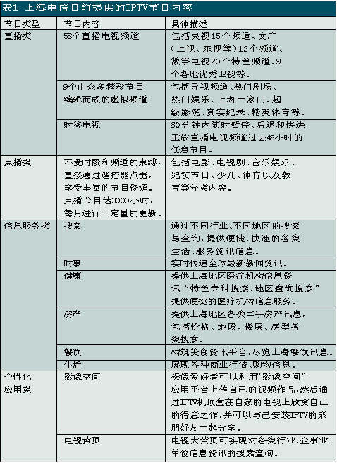 上海電信是國內(nèi)關(guān)注并切入IPTV業(yè)務(wù)較早的電信運(yùn)營商之一,自2005年就開始積極測試和試驗(yàn)。此次上海電信在全上海市范圍內(nèi)推出IPTV業(yè)務(wù),被業(yè)界看作是“中國IPTV規(guī)模商用的新紀(jì)元”。除了影視節(jié)目收看、視頻內(nèi)容點(diǎn)播、時(shí)移功能外,上海電信的IPTV服務(wù)還包括時(shí)事新聞、遠(yuǎn)程醫(yī)療、視頻房產(chǎn)信息、餐飲信息、天氣預(yù)報(bào)、票務(wù)查詢等信息服務(wù)以及可視電話、IPTV游戲等個(gè)性化應(yīng)用。其中IPTV的直播頻道有58個(gè),視頻點(diǎn)播可選節(jié)目量達(dá)3000小時(shí)以上。另外,上海電信還推出了影像空間和電視大黃頁等應(yīng)用服務(wù),攝像愛好者可以利用“影像空間”應(yīng)用平臺(tái)上傳自己的視頻作品,然后通過IPTV機(jī)頂盒在自家的電視上欣賞自己的得意之作,并可以與已安裝IPTV的親朋好友一起分享;電視大黃頁可實(shí)現(xiàn)對(duì)各類行業(yè)、企事業(yè)單位信息資訊的搜索查詢。