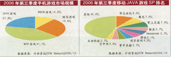 目前,中國手機用戶已經(jīng)突破4億。今年10月,計世資訊發(fā)布的調查報告說,2006年,中國手機游戲市場規(guī)模將超過18億元人民幣;稍早些時候,易觀國際的調查報告則顯示,今年中國的手機游戲市場規(guī)模接近22億元人民幣,到2008年時將超過60億元人民幣。在全球,手機游戲市場以每年超過40%的速度增長,已經(jīng)超過音樂和其他無線增值服務,成為未來無線增值服務的明星業(yè)務。