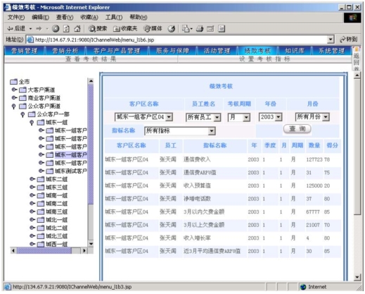作為電信營(yíng)銷服務(wù)支撐系統(tǒng),其主要功能是支撐營(yíng)銷人員開展?fàn)I銷活動(dòng),并通過功能完善的考核系統(tǒng)幫助各級(jí)人員進(jìn)行工作管理。本系統(tǒng)可以對(duì)KPI指標(biāo)進(jìn)行靈活的設(shè)定,可以靈活定義多種參與考核的數(shù)據(jù)來源,使得各級(jí)主管能夠?qū)蛻艚M、社區(qū)(商業(yè)客戶區(qū)、農(nóng)村統(tǒng)包區(qū))的營(yíng)銷服務(wù)工作進(jìn)行考核評(píng)分?己酥芷诳梢酝ㄟ^參數(shù)進(jìn)行設(shè)定(一般以月為單位)。