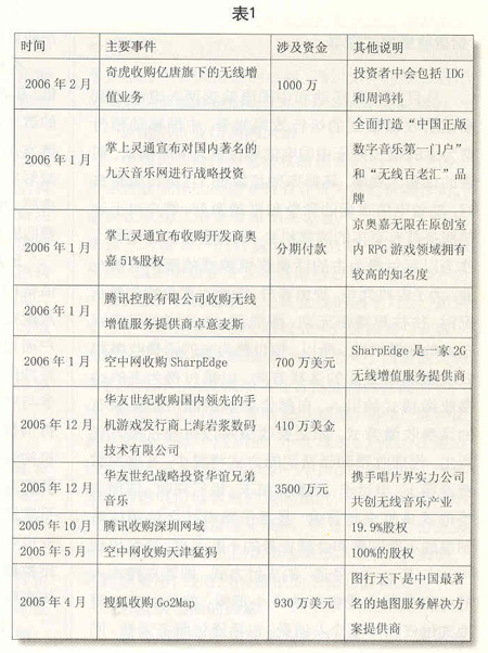 從2003年開始,國內(nèi)就顯現(xiàn)出并購增值服務(wù)運營企業(yè)的苗頭。2004年以來,隨著整治增值服務(wù)運營企業(yè)的力度不斷加大,并購漸成風(fēng)潮(見表1)。2004年2月,新浪收購深圳網(wǎng)興科技公司;2004年5月,搜狐收購手機WAP服務(wù)提供商北京吉菲爾公司。2005年,在“超級女生”節(jié)目大獲成功后,掌上靈通宣布將對國內(nèi)著名的九天音樂網(wǎng)進行戰(zhàn)略投資,全面打造“中國正版數(shù)字音樂第一門戶”和“無線百老匯”品牌。各大移動增值業(yè)務(wù)服務(wù)商通過并購競爭對手,門戶網(wǎng)站可以在移動增值服務(wù)領(lǐng)域?qū)で笮碌耐黄,獲得可觀的利益,增強自身的競爭力。伴隨著3G商用的日益臨近和市場競爭的不斷加劇,主流SP(服務(wù)提供商)進一步加快了資本購并和業(yè)務(wù)整合的步伐,整個SP行業(yè)將加速洗牌。經(jīng)過市場整合,主流SP將不斷做大做強,而相當多的缺乏市場競爭力的SP將被淘汰出局。