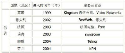 歐洲部分國家和地區(qū)進(jìn)入IPTV市場(chǎng)的年份及主要運(yùn)營(yíng)商