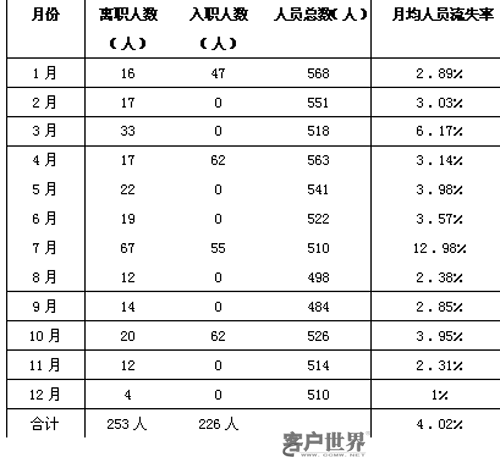 。5)該呼叫中心提供的年人員流失率的數(shù)值是將每月的人員流失率相加再除以12個月得出的,這個200X年度的人員流失率4.02%系“偷換概念”得出的結(jié)果。根據(jù)公式1