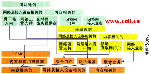 總之,在FMC新配置的價值鏈中,應(yīng)用和內(nèi)容的作用非常重要,因為他們在融合時將價值鏈中的各個部分連接起來。因此,可以認(rèn)為內(nèi)容和應(yīng)用的建立、積累將會推動增值FMC業(yè)務(wù)的發(fā)展。今后隨著在內(nèi)容和業(yè)務(wù)領(lǐng)域?qū)⒊霈F(xiàn)更多不同的參與者,如內(nèi)容提供商、應(yīng)用提供商和中間件提供商,F(xiàn)MC價值鏈將進(jìn)一步得到更深層次的合作、擴(kuò)張和合并。這些在新的價值鏈中出現(xiàn)的更多獨立但又不同的實體,將直接反映FMC融合的特征。
