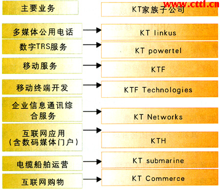目前,KT集團(tuán)是全業(yè)務(wù)運營商,同時也是韓國最大的固網(wǎng)運營商,它在FMC領(lǐng)域最大動作就是BcN寬帶融合網(wǎng)絡(luò),這是韓國政府為確保韓國在IT和電信技術(shù)市場持續(xù)領(lǐng)先地位而實行的IT839計劃的核心環(huán)節(jié)之一。BcN目的是要將有線與無線系統(tǒng)、通信和廣播系統(tǒng)融合在一起,為企業(yè)用戶和個人用戶提供一個共同的渠道收發(fā)語音、文本、圖像和視頻文件。為此,KT集團(tuán)順著新的價值鏈,對集團(tuán)內(nèi)部分機(jī)構(gòu)的功能進(jìn)行了調(diào)整,其主要組織架構(gòu)如圖2所示: