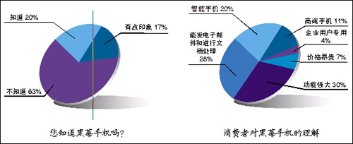 根據(jù)調(diào)查結(jié)果,目前國內(nèi)知道黑莓手機(jī)的消費者僅占20%,有63%的消費者從沒有聽說過“黑莓”這個名字,還有17%的消費者只是有點印象。