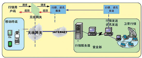 無(wú)線終端的請(qǐng)求通過(guò)各無(wú)線網(wǎng)絡(luò)進(jìn)入移動(dòng)證券系統(tǒng)的無(wú)線接入網(wǎng)關(guān),經(jīng)無(wú)線網(wǎng)關(guān)轉(zhuǎn)發(fā)至移動(dòng)交易行情服務(wù)平臺(tái)。如果是讀取行情資訊,行情服務(wù)平臺(tái)直接提供行情資訊服務(wù);如果是進(jìn)行委托交易,由委托接入服務(wù)器將委托數(shù)據(jù)轉(zhuǎn)發(fā)到總部或營(yíng)業(yè)部,再由總部或營(yíng)業(yè)部交易處理服務(wù)平臺(tái)進(jìn)行處理。換句話說(shuō),在無(wú)線網(wǎng)關(guān)接入后,其后的委托服務(wù)、行情服務(wù)都可采用現(xiàn)有的網(wǎng)上交易的通道和系統(tǒng)。