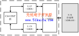 (1)存儲(chǔ)結(jié)構(gòu):DM642的存儲(chǔ)器系統(tǒng)由片內(nèi)內(nèi)存L1、L2和片外外存兩部分組成,L1,L2和片外SDRAM構(gòu)成了整個(gè)存儲(chǔ)器系統(tǒng)的三級層次結(jié)構(gòu),如圖2所示。其中,片內(nèi)內(nèi)存采用兩級緩存結(jié)構(gòu),第一級由L1P和L1D組成,L1距離DSP核最近,數(shù)據(jù)訪問速度最快,只需一個(gè)時(shí)鐘周期,只能作為不能尋址的Cache使用。第二級L2是一個(gè)統(tǒng)一的程序/數(shù)據(jù)空間,可以整體作為SRAM映射到存儲(chǔ)空間,也可以整體作為第二級Cache,或是二者按比例進(jìn)行組合。第三級是片外外存,一般由SDRAM構(gòu)成。L1Pcache大小為16KB,直接映射,每行大小32