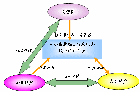 “中小企業(yè)綜合信息服務(wù)統(tǒng)一門(mén)戶(hù)平臺(tái)”的角色包括:運(yùn)營(yíng)商、企業(yè)用戶(hù)、大眾用戶(hù)三大角色。各角色與平臺(tái)之間及角色之間的業(yè)務(wù)關(guān)系如下: