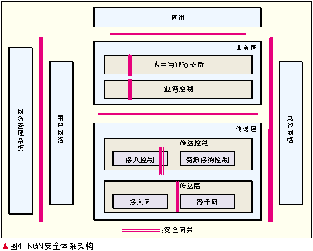 為了給網(wǎng)絡(luò)運(yùn)營(yíng)商、業(yè)務(wù)提供商和用戶提供一個(gè)安全可信的網(wǎng)絡(luò)環(huán)境,防止各種攻擊,NGN需要避免出現(xiàn)非授權(quán)用戶訪問網(wǎng)絡(luò)設(shè)備上的資源、業(yè)務(wù)和用戶數(shù)據(jù)的情況,需要限制網(wǎng)絡(luò)拓?fù)浣Y(jié)構(gòu)的可見范圍,需要保證網(wǎng)絡(luò)上傳送的控制信息、管理信息和用戶信息的私密性和完整性,需要監(jiān)督網(wǎng)絡(luò)流量并對(duì)異常流量進(jìn)行管理和上報(bào)。