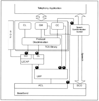 (3)CO(Connection)接口利用點(diǎn)對點(diǎn)信令發(fā)送TCS消息給L2CAP,以便在面向連接的信道上傳輸。