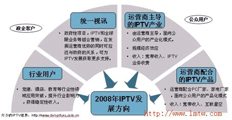 2008年,IPTV市場,因為發(fā)展速度明顯慢于了市場進(jìn)度和技術(shù)演進(jìn)。因此在原有的運(yùn)營商產(chǎn)業(yè)化推動形勢下,終端廠家推動下的產(chǎn)品化發(fā)展模式也會得到更大的發(fā)展空間,而這在一定程度上雖會推動用戶對IPTV的認(rèn)知度,同時也會分化一部分IPTV產(chǎn)業(yè)化的動力。