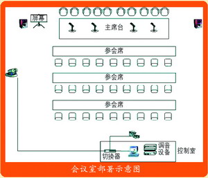 中大型會議室約在150~250平米,一般為教室型布局,即主要人員和領(lǐng)導在主席臺就座,參會人員在臺下就坐,這種情況的布局和設(shè)備放置的情況如圖所示。