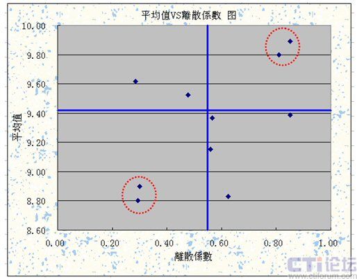 利用散點(diǎn)圖很容易找出我們的內(nèi)部標(biāo)竿,例如下面這張圖是每個(gè)班組小休率在12月份的平均值和離散系數(shù),可以清楚的看到,這四個(gè)象線的左下角,有兩個(gè)班組的小休率的平均值低于9以下,有一個(gè)班組甚至在8.8左右,這兩個(gè)班組不只是平均值最低,而且在12月份每一天的小休率也是控管的最好,差異是最小的。