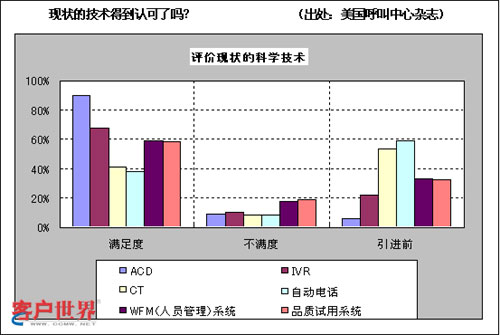 這是調(diào)查美國(guó)客服中心的管理者們?nèi)绾卧u(píng)價(jià)自己公司引進(jìn)技術(shù)的統(tǒng)計(jì)表。雖然“滿(mǎn)意”并不意味著“相關(guān)技術(shù)被有效利用”?墒菑恼{(diào)查結(jié)果來(lái)看,他們對(duì)技術(shù)的滿(mǎn)意度相當(dāng)高,并且看起來(lái)都在有效利用相關(guān)技術(shù)。