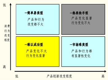 一般來(lái)說(shuō),產(chǎn)品創(chuàng)新程度越大,取得突破性的成就就越大,但這往往需要消費(fèi)者改變消費(fèi)行為和習(xí)慣。消費(fèi)行為的改變是一個(gè)漸進(jìn)的過(guò)程。對(duì)于企業(yè)來(lái)說(shuō),開(kāi)發(fā)一個(gè)對(duì)客戶(hù)有價(jià)值的創(chuàng)新產(chǎn)品,要想獲得成功,必須盡量減少消費(fèi)者行為的改變。我們以消費(fèi)行為改變程度和產(chǎn)品創(chuàng)新改變程度兩方面進(jìn)行組合得到一個(gè)矩陣: