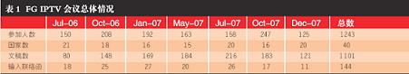 FGIPTV在一年半的時(shí)間里共召開(kāi)了7次會(huì)議,收到了1101篇文稿,參加者包括來(lái)自40個(gè)國(guó)家的1243名專家(見(jiàn)表1),其中既包括傳統(tǒng)電信網(wǎng)的專家,也包括來(lái)自廣播電視行業(yè)、IT業(yè)的專家,通過(guò)這7次會(huì)議、提交的文稿以及專家們的貢獻(xiàn),一方面產(chǎn)生了IPTV的定義,另一方面也形成了21個(gè)工作文檔,并根據(jù)這些文檔的內(nèi)容確定了負(fù)責(zé)此文檔的相應(yīng)研究組和課題(即Q/SG),詳見(jiàn)表2。