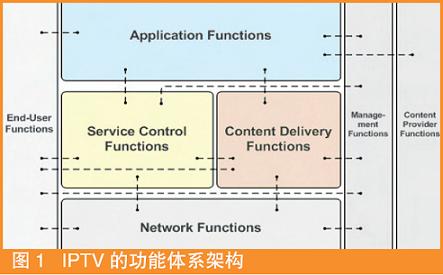 最終的IPTV的體系架構(gòu)與第六次會(huì)議的體系架構(gòu)沒(méi)有太大的差別,只是在細(xì)微之處進(jìn)行了細(xì)化和完善。IPTV的功能體系架構(gòu)包含7個(gè)部分:端用戶功能、應(yīng)用功能、業(yè)務(wù)控制功能、內(nèi)容分發(fā)功能、網(wǎng)絡(luò)功能、管理功能和內(nèi)容提供功能,如圖1所示。