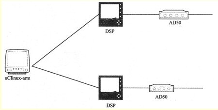下一代媒體網(wǎng)關(guān)系統(tǒng)主要由媒體網(wǎng)關(guān)、媒體網(wǎng)關(guān)控制器和信令網(wǎng)關(guān)組成,實(shí)現(xiàn)了功能上的分解。為了適應(yīng)不同的網(wǎng)絡(luò),本文主要介紹了媒體網(wǎng)關(guān)的實(shí)現(xiàn)方法,其中媒體網(wǎng)關(guān)的主要作用是實(shí)現(xiàn)模擬信號(hào)由電路交換轉(zhuǎn)換成數(shù)字信號(hào)PCM編碼,并進(jìn)行G.711或者G.723等格式編碼。為了實(shí)現(xiàn)媒體網(wǎng)關(guān),整個(gè)系統(tǒng)由3部分組成,包括基于ARM架構(gòu)的嵌入式系統(tǒng)(uClinux)、語(yǔ)音信號(hào)轉(zhuǎn)換芯片(TLC320AD50)和定點(diǎn)數(shù)字信號(hào)處理器(TMS320VC54xx),如圖3所示。