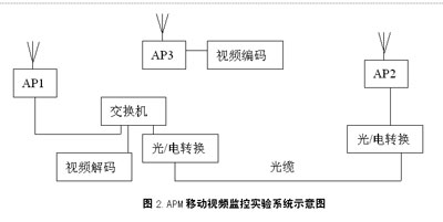 為了保證APM移動視頻監(jiān)控系統(tǒng)的整體性能,筆者就APM系統(tǒng)無線網(wǎng)絡和視頻編碼器的各自性能,進行了實驗。本次實驗采用兩個步驟,即實驗室測試和現(xiàn)場模擬實驗測試,并在實驗室測試的基礎上,對無線網(wǎng)絡和視頻編碼器間的初步配合進行現(xiàn)場實驗測試,F(xiàn)場的實驗系統(tǒng)組成如圖2所示。