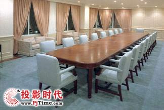 該會議室采用淺灰色色調(diào),與普通會議室沒有太大差別,采用頂部吊掛的投影機作為視頻的輸出設(shè)備,節(jié)省了會議室的空間,系統(tǒng)設(shè)備配置略復(fù)雜,具體如下: