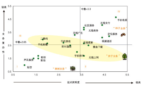 根據(jù)“業(yè)務復雜性—技術困難度”模型,可以清晰地看到一個業(yè)務的成功商用和業(yè)務復雜性與技術困難度密切相關,如短信和彩鈴等復雜性與技術困難度都很低的業(yè)務是比較容易成功商用的,將這一類業(yè)務歸類為“果樹業(yè)務”,在第一象限(象限I)。還有一些業(yè)務如即時通信、整曲下載和無線搜索等業(yè)務,已經(jīng)開始快速增長但是其用戶規(guī)模和收入量都還低于“果樹業(yè)務”,在業(yè)務復雜性與技術困難度坐標中這類業(yè)務處于4個象限交匯的中部區(qū)域(即圖中黃色區(qū)域),由于業(yè)務復雜性和技術困難度都會隨時間而減小,從而這一區(qū)域的業(yè)務會向第一象限演進,這類業(yè)務稱為“苗子業(yè)務”,即在3年內能夠成熟的業(yè)務。在坐標系的右上角第四象限,即業(yè)務復雜性和技術困難度均較高的業(yè)務,稱之為“種子業(yè)務”,這類業(yè)務在短期內很難快速成長。