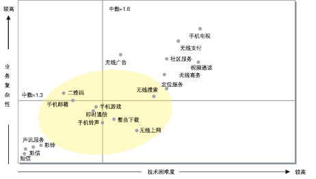 諾基亞西門子通信借鑒國外的無限增值業(yè)務經(jīng)驗和對國內運營商業(yè)務的分析提出“技術困難度—業(yè)務復雜性”模型來詮釋無線增值業(yè)務。