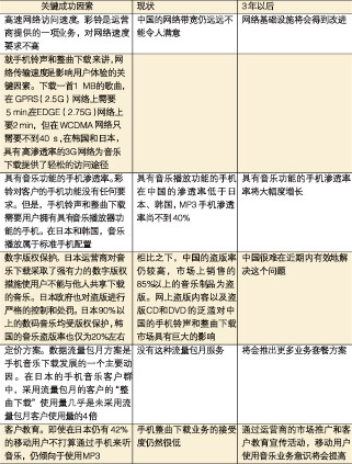 無線音樂市場的現(xiàn)狀、3年以后的情況以及成功的關鍵因素歸納總結見表2。