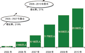 從2005年到2010年,預計中國無線搜索用戶數(shù)量的變化如圖4所示。