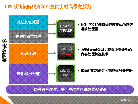 LSI的高級通信處理器可實(shí)現(xiàn)出色的服務(wù)質(zhì)量、高等級與流量管理能力,對于通過基于數(shù)據(jù)包的網(wǎng)絡(luò)交付像實(shí)時(shí)視頻這樣的新服務(wù)與服務(wù)而言,這些技術(shù)至關(guān)重要。由于網(wǎng)絡(luò)對高帶寬的需求越來越大,一般的網(wǎng)絡(luò)處理器可擴(kuò)展性跟不上網(wǎng)絡(luò)的發(fā)展步伐。然而,LSI 的 NPU 則能將數(shù)據(jù)和控制路徑分開,更加有效地交付媒體流,從而保證了實(shí)時(shí)可靠性和真正的線速性能。這樣移動用戶可以享受到卓越的視頻質(zhì)量。