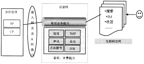用戶不再是直接通過電話終端使用話音應用,而是通過PC(或PDA等)在互聯(lián)網應用中使用話音業(yè)務,因此操作界面非常友好,互聯(lián)網應用在后臺通過調用電信業(yè)務平臺的接口能力使用話音網絡資源能力,這些網絡資源能力包括VoIP、點擊撥號、短信、多方會議、聲訊、IVR等,因此話音網資源借助豐富的互聯(lián)網應用激發(fā)了潛力。