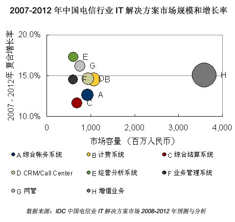 IDC預(yù)計(jì),2007-2012年電信行業(yè)將注重運(yùn)營支撐系統(tǒng)的全業(yè)務(wù)運(yùn)營整合和支持前端業(yè)務(wù),因此3G增值業(yè)務(wù)、經(jīng)營分析系統(tǒng)、客戶關(guān)系管理系統(tǒng)、IT服務(wù)管理系統(tǒng)等建設(shè)將實(shí)現(xiàn)快速增長。已有項(xiàng)目仍然會(huì)持續(xù)升級維護(hù),以及配合全業(yè)務(wù)運(yùn)營作出功能上的提升。2007年電信IT應(yīng)用解決方案(僅含解決方案供應(yīng)商自有軟件及其相關(guān)服務(wù)包括BSS/OSS/MSS/VAS)市場規(guī)模為97.27億元人民幣,占整體電信軟件和服務(wù)市場容量的74.5%。2012年電信行業(yè)IT解決方案整體市場規(guī)模將達(dá)到193.5億元人民幣。