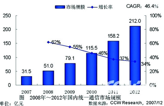 國內(nèi)外市場分析機(jī)構(gòu)先后推出關(guān)于統(tǒng)一通信的調(diào)查報(bào)告和分析預(yù)測: 計(jì)世資訊今年6月發(fā)布的最新報(bào)告顯示,2008年國內(nèi)統(tǒng)一通信的市場規(guī)模將達(dá)到51億元人民幣,而從2008年到2012年,在未來五年的時(shí)間里,國內(nèi)統(tǒng)一通信市場將保持較快的增長趨勢,年復(fù)合增長率將達(dá)到46.4%,截至2012年,國內(nèi)統(tǒng)一通信市場的規(guī)模將達(dá)到212億元人民幣。