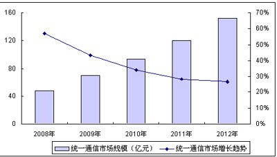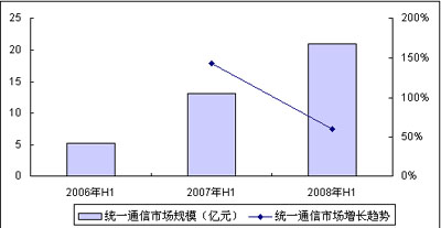統(tǒng)一通信作為一種以融合技術(shù)為基本特征的特定解決方案和應(yīng)用,通過(guò)對(duì)各種溝通方式進(jìn)行有效的融合,滿(mǎn)足用戶(hù)方便快捷的信息獲取和溝通需求,近年來(lái)在全球范圍內(nèi)得到了迅猛發(fā)展,各大通信與信息技術(shù)相關(guān)廠商紛紛加入統(tǒng)一通信市場(chǎng)的競(jìng)爭(zhēng)中。賽迪顧問(wèn)數(shù)據(jù)統(tǒng)計(jì)顯示,2008年上半年,中國(guó)統(tǒng)一通信整體市場(chǎng)規(guī)模已達(dá)到21.01億元,同比增長(zhǎng)超過(guò)60.9%,繼續(xù)保持強(qiáng)勁的增長(zhǎng)勢(shì)頭。